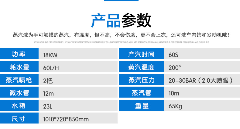 1.緊湊美觀,操作簡(jiǎn)單,顯示直觀,傻瓜電控,穩(wěn)定可靠!2.純不銹鋼組合體,不銹鋼盤管,不生銹,重量輕,耐用度高!3.噴頭標(biāo)配2.0大噴眼,持續(xù)放氣20公斤壓力,蒸汽壓力大氣量大。4.采用全新的日本進(jìn)口水泵和換熱技術(shù),從而大大的提高了工作效率,節(jié)能環(huán)保。5.新增流量控制技術(shù)(檢測(cè)水泵實(shí)工作情況),冷機(jī)啟動(dòng)10秒蒸汽,加熱速度快,效率高。6.清潔劑箱15升,水箱23升,內(nèi)置水位閥,可手動(dòng)或者自動(dòng)加水,缺水自動(dòng)提示。7.18KW電加熱,帶強(qiáng)排防凍功能,冬季使用無(wú)憂,用于洗車店或者工廠油污清洗,壓力大氣量大,蒸汽干濕度可調(diào),一機(jī)多用,效果顯著!