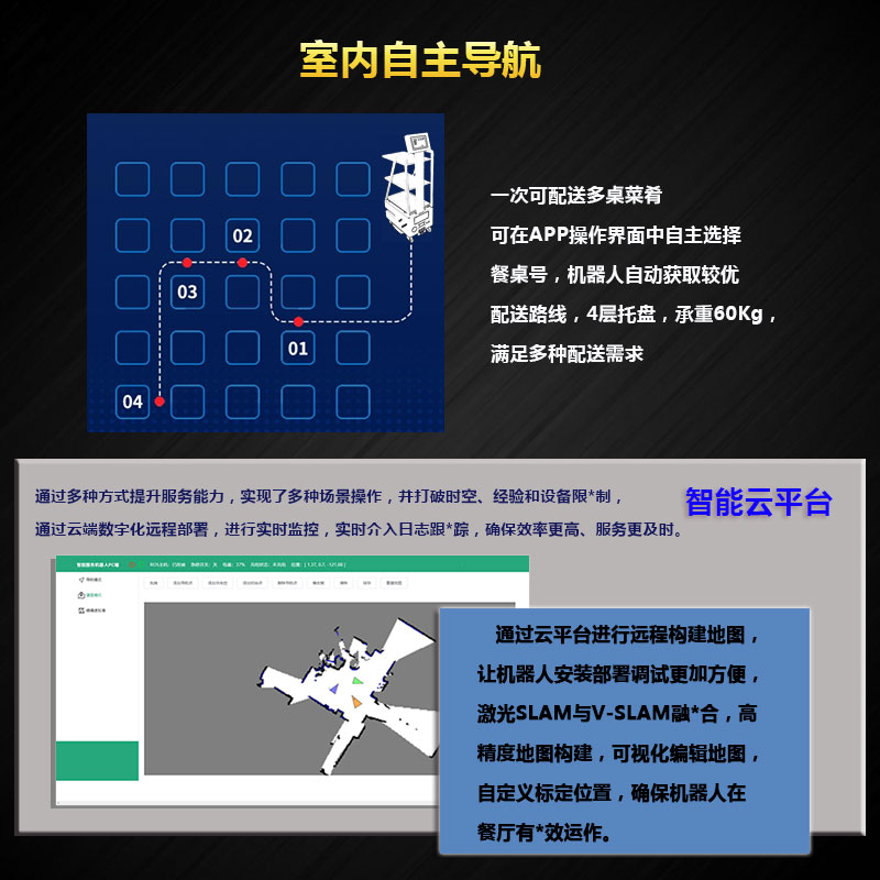 闖王智能送餐機(jī)器人有著精美的米白色外觀、厘米級精*準(zhǔn)導(dǎo)航、全球領(lǐng)~先的遠(yuǎn)程部署技術(shù)、多 機(jī)協(xié)調(diào)能力、自動(dòng)避障等功能,能在室內(nèi)自動(dòng)導(dǎo)航到指定的位置。機(jī)器人可在電量低于設(shè)定閾值的情況下,自動(dòng)檢測電量,進(jìn)行自動(dòng)充電。一鍵啟動(dòng),自主任務(wù),多種配送模式,多層托盤,能夠快速部署,智能分析,智能調(diào)度,智能配送,靈動(dòng)語音,多功能智操屏幕,可以代替人工運(yùn)輸,解放雙手,緩解用工緊張,節(jié)省時(shí)間節(jié)省成本,方便快捷,操作簡單,使用方便,適用于餐廳、酒店、超市、會(huì)所、KTV、美容院等場所。