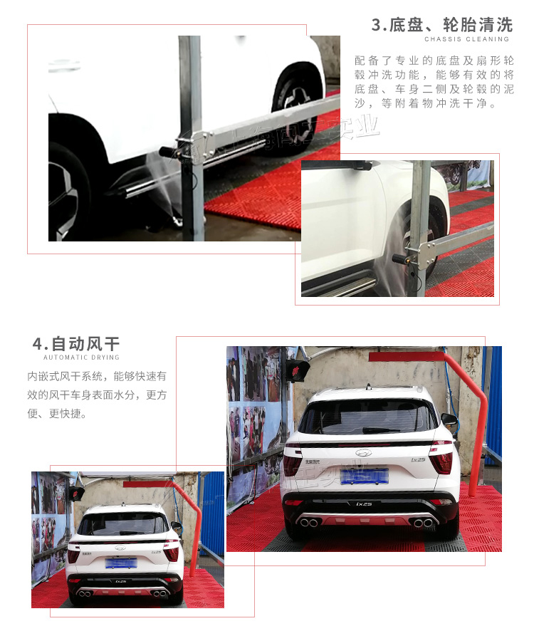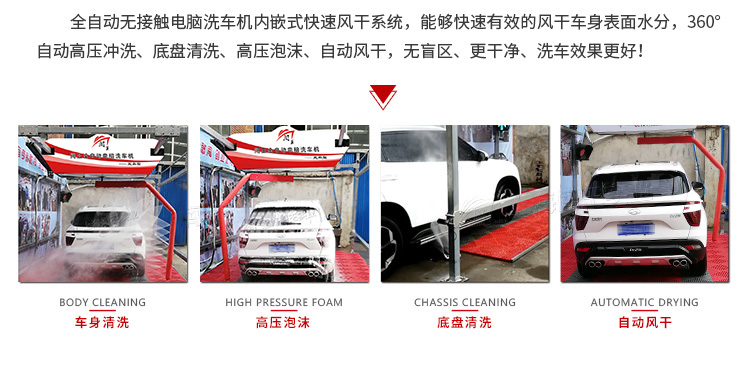 闖王風(fēng)尚型全自動洗車機(jī),高壓泡沫無需人工操作,自動調(diào)比。通過混合、霧化等步驟,形成微顆粒狀,噴灑覆蓋車身表面,接觸污漬,包括車身縫隙都夠均勻覆蓋;360°旋轉(zhuǎn)式高壓沖洗,勻速、勻壓、勻距的沖洗方式,清洗盲區(qū);配備底盤及扇形輪轂沖洗功能,能夠有效的將底盤、車身二側(cè)及輪轂的泥沙,等附著物沖洗干凈;自動風(fēng)干