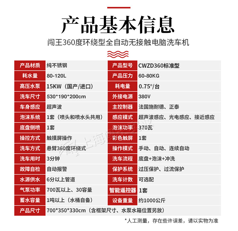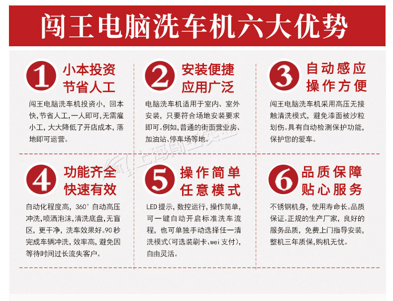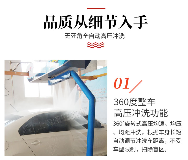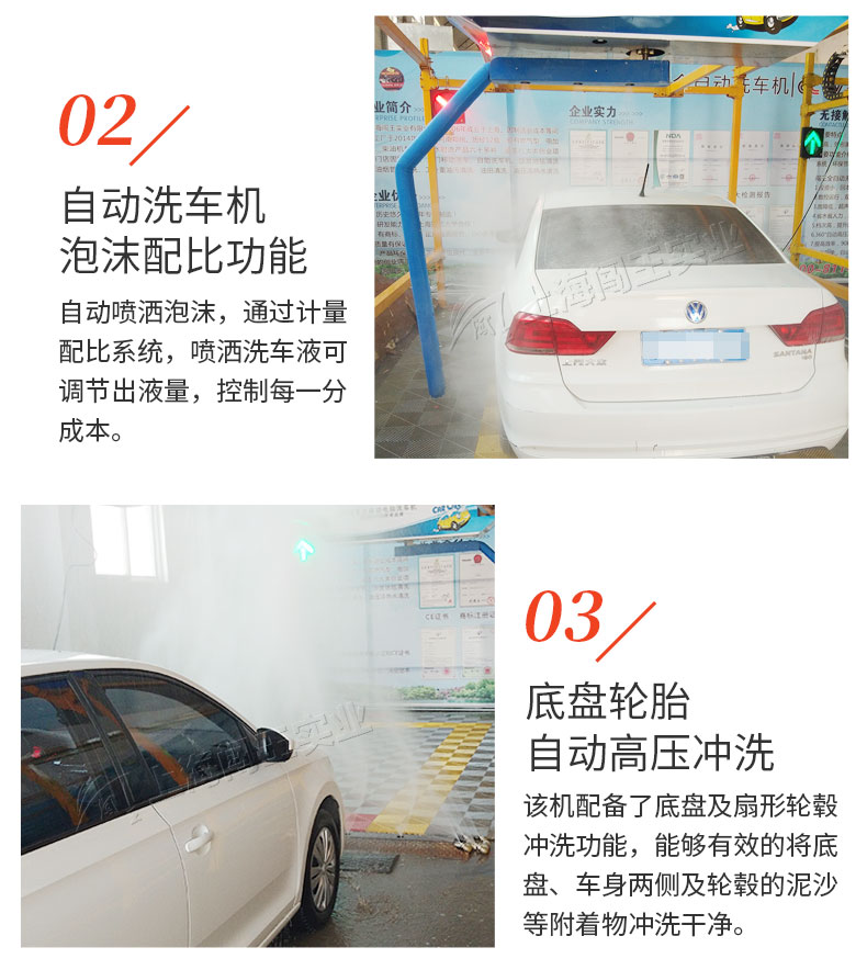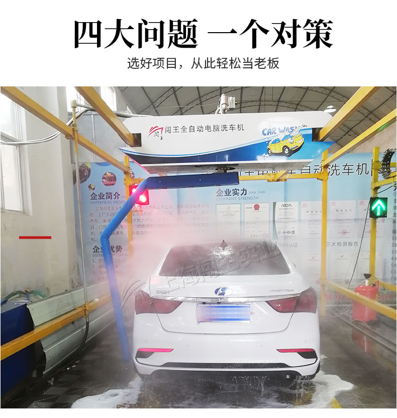 闖王標(biāo)準(zhǔn)型全自動洗車機(jī),感應(yīng)式開關(guān),車輛經(jīng)過,底噴系統(tǒng)自動清洗底盤,側(cè)噴系統(tǒng)自動清洗輪轂,無死角。多液復(fù)用,自動噴灑泡沫,泡沫均勻覆蓋到車身表面,對付頑固污漬。360°環(huán)繞型智能無接觸清洗,不接觸車身,對車漆不會造成傷害,無盲區(qū),更干凈。全自動洗車機(jī)優(yōu)勢分析,洗車速度快,大大的提升了洗車效率;節(jié)省人工,降低勞動力成本;操作方便,界面簡單易懂;成本低,創(chuàng)造的價(jià)值高;形象好,提升店鋪公信力,更容易吸引客戶,留住客戶;減少客戶等待時(shí)間,提高客戶粘性;易操作,不偷懶,24小時(shí)都可以工作,店面管理更安心。