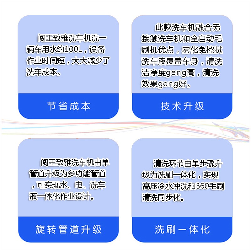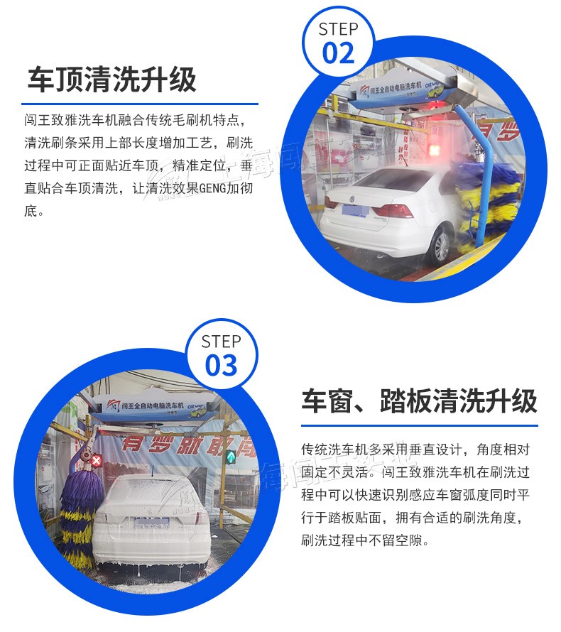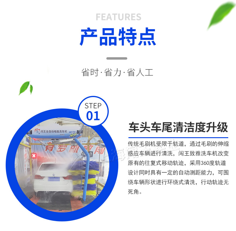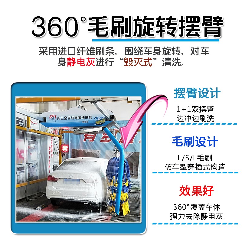 闖王360度毛刷洗車機(jī)用的是進(jìn)口泡棉刷、不傷車漆、不沾泥沙、不易纏繞雜物、柔軟耐磨、洗凈度高。操作簡(jiǎn)單省時(shí)省力自動(dòng)清洗,1+1雙擺臂邊沖邊刷洗,L/S/L毛刷仿車型穿插式構(gòu)造,360°覆蓋車體強(qiáng)力去除靜電灰,加油站引流機(jī)型。 闖王360度毛刷洗車機(jī)用的是進(jìn)口泡棉刷、不傷車漆、不沾泥沙、不易纏繞雜物、柔軟耐磨、洗凈度高。操作簡(jiǎn)單省時(shí)省力自動(dòng)清洗,1+1雙擺臂邊沖邊刷洗,L/S/L毛刷仿車型穿插式構(gòu)造,360°覆蓋車體強(qiáng)力去除靜電灰,加油站引流機(jī)型。自動(dòng)風(fēng)干系統(tǒng),能夠快速高效的風(fēng)干車身表面水分,更方便、更快捷。