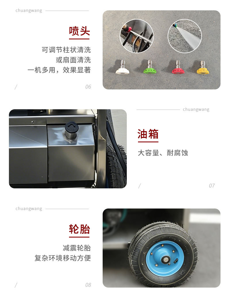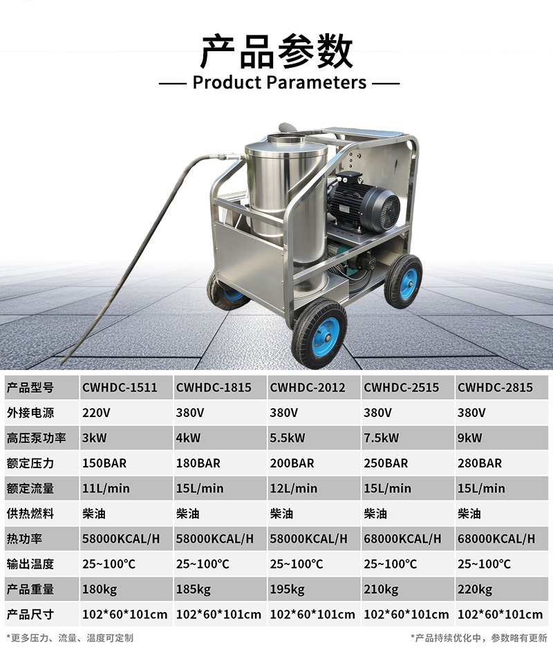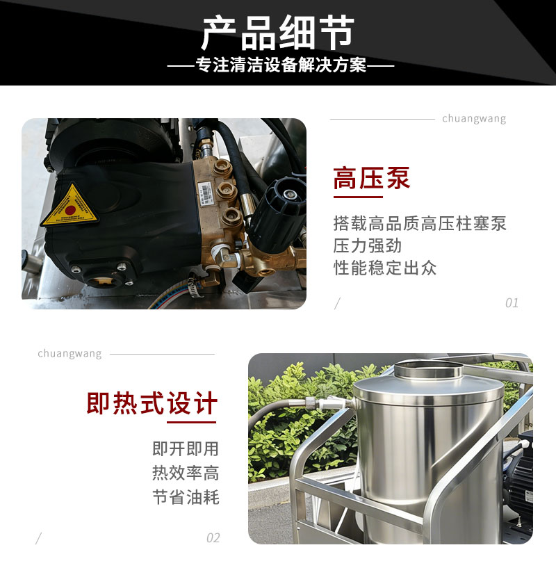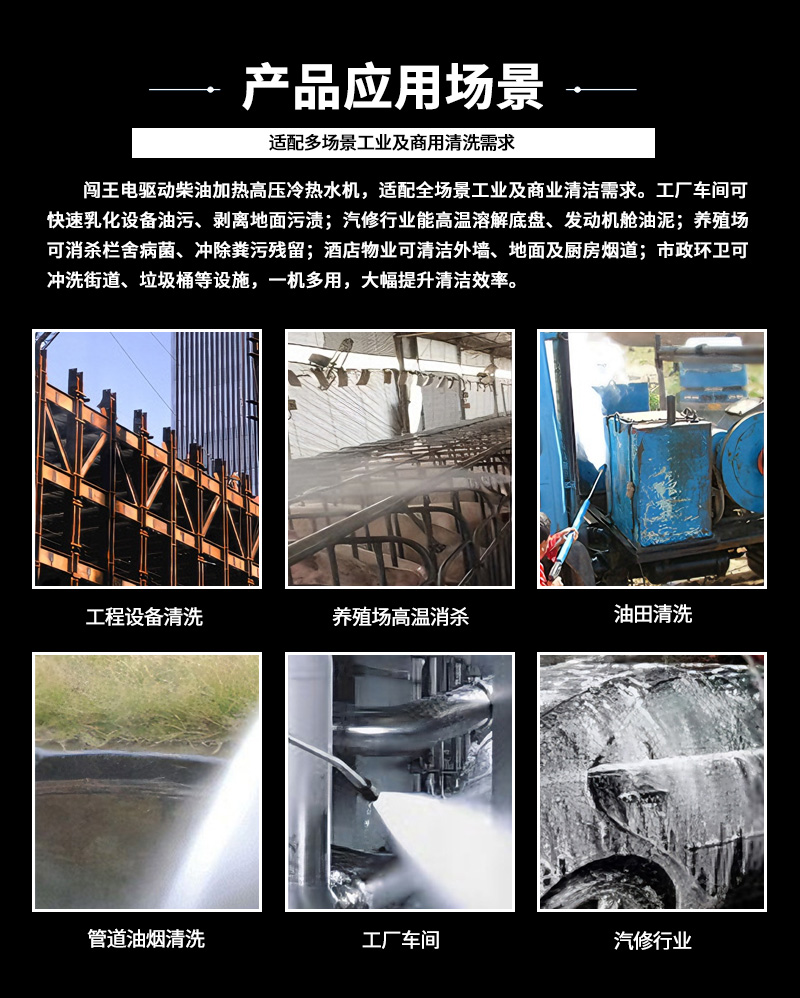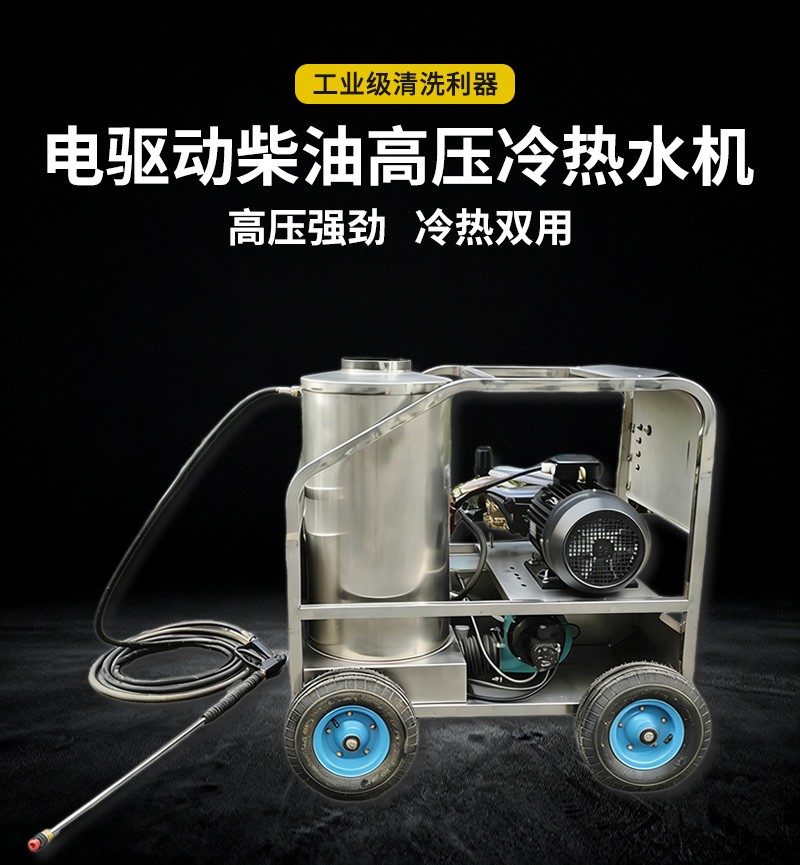 本款電驅(qū)動柴油加熱高壓冷熱水清洗機,電驅(qū)動動力強勁,柴油快速加熱,冷水高壓沖洗、高溫熱水除油,高效去除重油污、油垢、頑固污漬。適用于工廠車間、機械設(shè)備、汽修廠、養(yǎng)殖場、工程車輛、管道等工業(yè)及商用清潔,耐用穩(wěn)定、移動方便、清潔效率高。