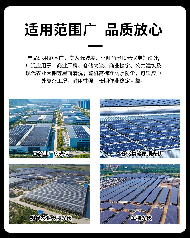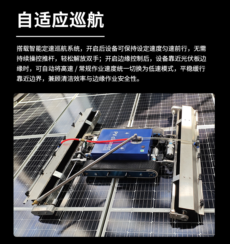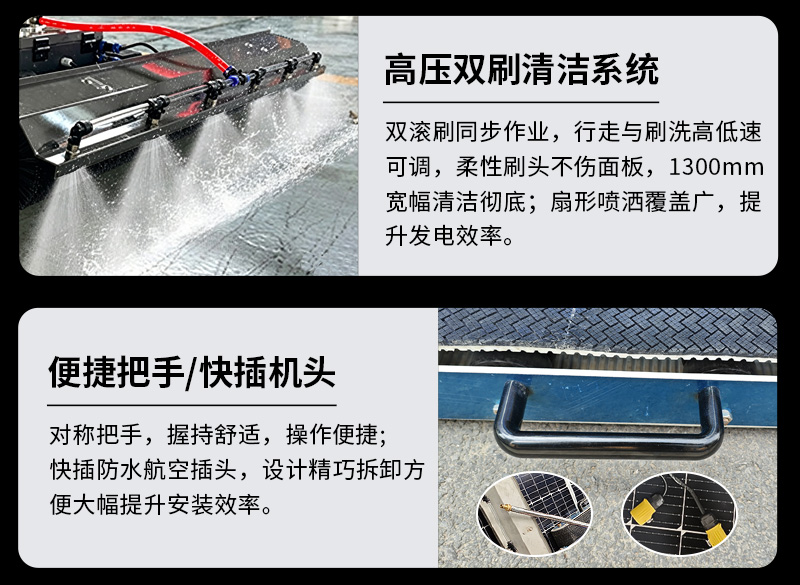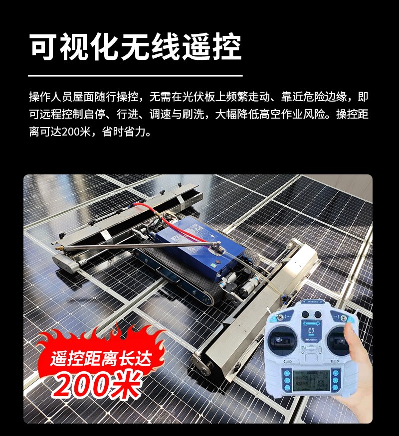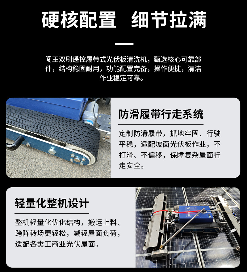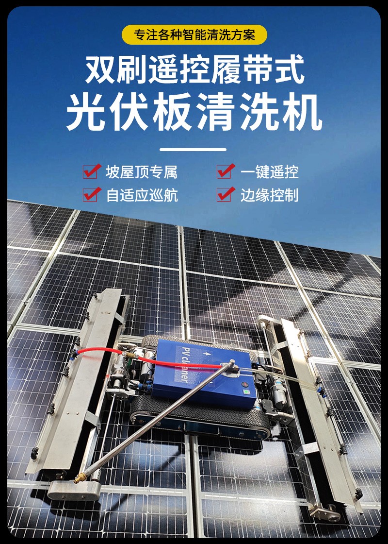 本款雙頭遙控履帶式光伏板清洗機(jī),聚焦低坡度坡屋頂光伏運(yùn)維,創(chuàng)新適配小角度屋面場景。雙頭同步清潔效率高,遙控遠(yuǎn)程操作更安全,履帶式底盤行走穩(wěn)定,不損傷光伏面板,防水耐用適應(yīng)戶外環(huán)境,是坡屋頂光伏電站清潔、降本增效的理想設(shè)備。